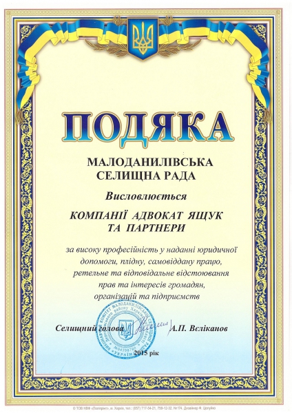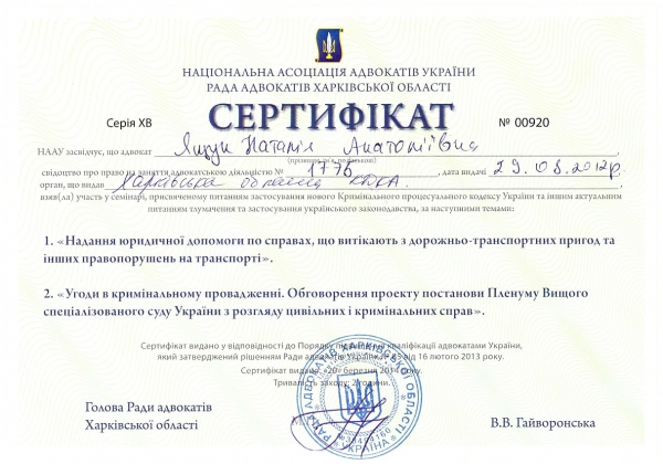 Адвокат предоставляет правовую помощь на основании свидетельства о праве на занятие адвокатской деятельностью №1775, выданного Харьковской областной квалификационно-дисциплинарной комиссией адвокатуры.
